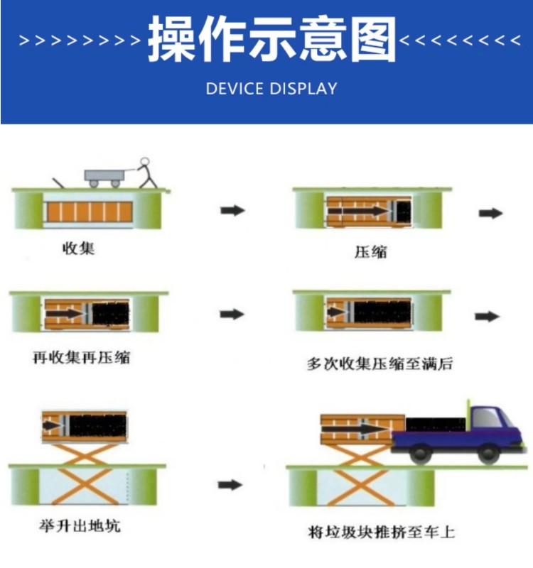 水平式生活垃圾壓縮中轉設備是將垃圾的卸(出)料、壓縮、儲存集合在一起,整體落于地下,利用地下空間將垃圾密閉在箱體內,地面上無垃圾外露現象,壓縮垃圾產生的污水經排污管道直接流入污水井內,然后由污水泵排到城市污水管網,徹底解決了垃圾在收集、儲存、裝運過程中的污染環境、作業效率低等問題。