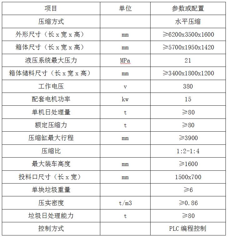 全封閉水平壓縮:采用水平壓縮方式,垃圾壓縮密度≥0.86t/m3,垃圾壓縮后體積大大減小,從而大幅度提高轉(zhuǎn)運(yùn)車(chē)輛裝載量和轉(zhuǎn)運(yùn)效率,降低垃圾處理、轉(zhuǎn)運(yùn)等費(fèi)用;